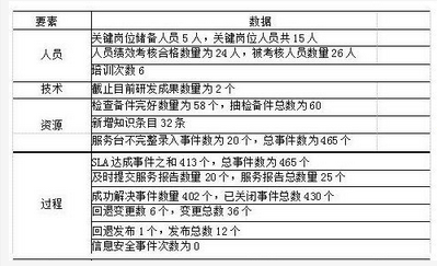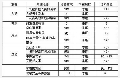1.参考答案:(1)关键岗位人员储备率:5/15=33.33%(2)人员绩效考核合格率:24/26=92.31%(3)备件可用率:58/60=96.67%(4)服务台录入事件的完整性:445/465=95.70%(5)SLA 达成率:413/465=88.82%(6)服务报告交付及时率:20/25=80.00%(7)变更成功率:30/36=83.33% 2.参考答案:(结合上题指标欠缺之处从如下选项中答出 6 点即可)人员要素:人员储备与连续性管理(人员储备率为33.33%储备率不足,应该重视储备管理)、人员能力评价与管理、人员绩效管理、人员培训计划执行(2)资源要素:工具管理、知识管理、服务台管理与评价、备品备件管理(3)技术要素:技术研发规划、技术研发预算、技术成果的运行与改进、(4)过程要素:服务级别管理、服务报告管理、事件管理、问题管理、配置管理、变更管理、发布管理、安全管理、连续性和可用性管理、容量管理3.参考答案:(1)针对沟通问题,建立良好的沟通协作机制,进行服务意识及沟通能力培训;(2)针对人员连续性问题,实行有效的人员连续性管理措施;(3)针对负面情绪,引导积极向上的团队文化,举行团队活动等其他方式进行团队建设;(4)针对考核指标不明确,按照 SMART 原则定义人员绩效指标。4.参考答案:知识获取,知识共享,知识的保留、归档与入库,知识评审。