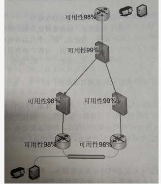 <p>下图是某数据中心网络结构示意图,图中网络的可用性是()(0.98*0.99=0.97,0.98*0.98=0.96)。