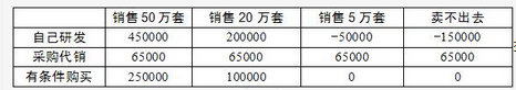 S公司开发一套信息管理软件,其中一个核心模块的性能对整个系统的市场销售前景影响极大,该模块可以采用S公司自己研发、采购代销和有条件购买三种方式实现。S公司的可能利润(单位万元)收入如下表。 按经验,此类管理软件销售50万套,20万套,5万套和销售不出的概率分别为15%,25%,40%和20%,则S公司应选择()方案。