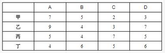 某企业准备将4个工人甲、乙、丙、丁分配在 A、 B、 C、D共4个岗位。每个工人由于技术水平不同,在不同岗位上每天完成任务所需的工时见下表。适当安排岗位,可使4个工人以最短的总工时()全部完成每天的任务。