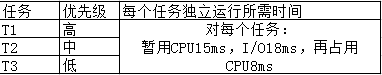 在一个单CPU的计算机系统中,采用可剥夺式(也称抢占式)优先级的进程调度方案,且所有任务可以并行使用I/O设备。下表列出了三个任务T1、T2、T3的优先级、独立运行时占用CPU和I/O设备的时间。如果操作系统的开销忽略不计,这三个任务从同时启动到全部结束的总时间为(47)ms,CPU的空闲时间共有(48)ms。