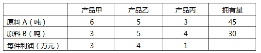 某厂准备生产甲、乙、丙三种产品,生产每件产品所需的 A、B两种原料数量,能获得的利润,以及工厂拥有的原料数量如下表 根据该表,只要安排好生产计划,就能获得最大利润(54)万元。