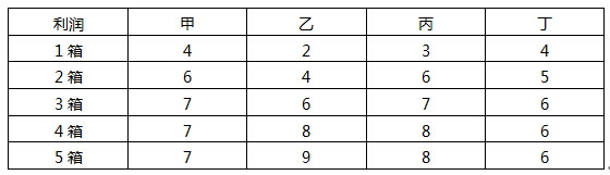 某批发站准备向甲、乙、丙、丁四家小商店供应5箱商品。批发站能取得的利润(单位:百元)与分配的箱数有关(见下表)。 批发站为取得最大总利润,应分配__(57)__。