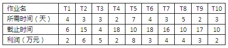 某团队希望在未来18天内串行选做若干个作业。供选各作业所需的实施时间(天数)、截止时间(最迟必须在指定的数天内完工)以及利润见下表: 该团队只要能适当选择若干个作业依次实施,就能获得最大利润(58)万元。