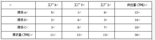 设三个煤场 A、 B、C分别能供应煤12、14、10万吨,三个工厂X、Y、Z分别需要煤11、12、13万吨,从各煤场到各工厂运煤的单价(百元/吨)见下表方框内的数字。只要选择最优的运输方案,总的运输成本就能降到()百万元。