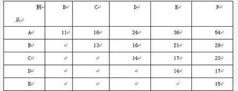 <p>下表记录了六个结点 A、 B、 C、 D、 E、F之间的路径方向和距离。从A到F的最短距离是() <img a