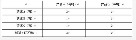 某厂拥有三种资源 A. B、 C.生产中、乙两种产品。生产每吨产品需要消耗的资源、可以获得的利润见下表。日前,该厂拥有资源 A、资源B和资源C分別为12吨,7吨和12吨。根据上述说明,适当安排甲、乙两种产品的生产量,就能获得最大总利润(请作答此空)。如果生产计划只受资源A和C的约束,资源B很容易从市场上以每吨0.5百万元购得,则该厂宜再购买()资源 B,以获得最大的总利润。