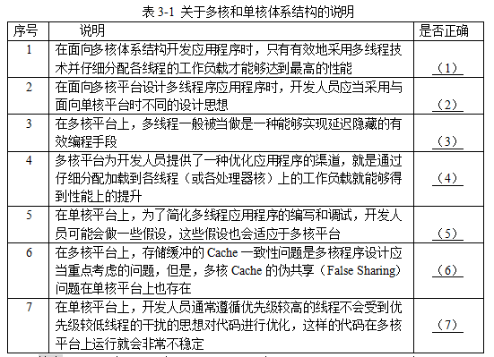 请根据自己所掌握的多核、多线程的知识,判别表3-1给出的说法是否正确,并将答案写在答题纸上对应空白处(填写正确或错误)。