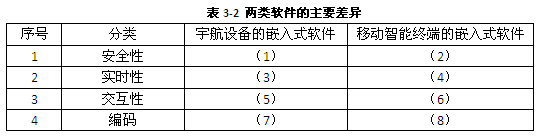 请用300字以内文字,说明宇航设备的嵌入式软件与移动智能终端嵌入式软件在安全性(safety)、实时性、交互性设计和编码方面的要求有何差异,请填写表3-2中的空格(1)~(8),将解答写在答题纸的对应栏内。