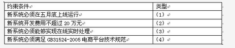 【说明】某公司是一家以运动健身器材销售为主营业务的企业,为了扩展销售渠道,解决原销售系统存在的许多问题,公司委托某软件企业开发一套运动健身器材在线销售系统。目前,新系统开发处于问题分析阶段,所分析各项内容如下所述:(a)用户需要用键盘输入复杂且存在重复的商品信息;(b)订单信息页面自动获取商品信息并填充;(c)商品订单需要远程访问库存数据并打印提货单;(d)自动生成电子提货单并发送给仓库系统;(e)商品编码应与原系统商品编码保持一致;(f)商品订单处理速度太慢;(g)订单处理的平均时间减少30%;(h)数据编辑服务器CPU性能较低;(i)系统运维人员数量不能增加。【问题3】(8分)系统约束条件可以分为四类,请将类别名称填入表中(1)~(4)对应的位置。表1-2约束条件分类