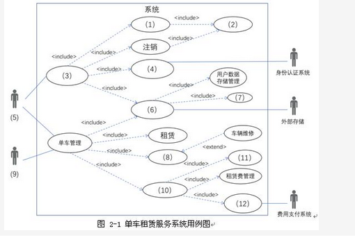 【说明】某软件公司为共享单车租赁公司开发一套单车租赁服务系统,公司项目组对此待开发项目进行了分析,具体描述如下:1)用户(非注册用户)通过手机向租赁服务系统进行注册,成为可租赁共享单车的合法用户,其中包括提供身份、手机号等信息,并支付约定押金;2)将采购的共享单车注册到租赁服务系统后方可投入使用。即将单车的标识信息(车辆编号、二维码等)录入到系统;3)用户(注册或非注册用户)通过手机查询可获得单车的地理位置信息以便就近取用;4)用户(注册用户)通过手机登录到租赁服务系统中,通过扫描二维码或输入车辆编号以进行系统确认,系统后台对指定车辆状态(可用或不可用),以及用户资格进行确认,通过确认后对车辆下达解锁指令;5)用户在用完车辆后关闭车锁,车辆自身将闭锁状态上报到租赁服务系统中,完成车辆状态的更新和用户租赁费用结算;6)系统应具备一定的扩容能力,以满足未来市场规模扩张的需要。项目组李工认为该系统功能相对独立,系统可分解为不同的独立功能模块,适合采用结构化分析与设计方法对系统进行分析与设计。但王工认为,系统可管理的对象明确,而且项目团队具有较强的面向对象系统开发经验,建议采用面向对象分析与设计方法。经项目组讨论,决定采用王工的建议,采用面向对象分析与设计方法开发系统。【问题2】(12分)请分析下面A~Q所列出的共享单车租赁服务系统中的概念类及其方法,在图2-1所示用例图(1)~(12)处补充所缺失信息。(2)A.用户,B.共享单车,C.用户管理,D.注册,E.注销,F.用户查询,G单车管理,H.租赁,I.归还,J.单车查询,K.费用管理,L.保证金管理,M.租赁费管理,N.数据存储管理,O.用户数据存储管理,P.单车数据存储管理,Q.费用结算,R.身份认证