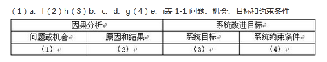 【说明】某公司是一家以运动健身器材销售为主营业务的企业,为了扩展销售渠道,解决原销售系统存在的许多问题,公司委托某软件企业开发一套运动健身器材在线销售系统。目前,新系统开发处于问题分析阶段,所分析各项内容如下所述:(a)用户需要用键盘输入复杂且存在重复的商品信息;(b)订单信息页面自动获取商品信息并填充;(c)商品订单需要远程访问库存数据并打印提货单;(d)自动生成电子提货单并发送给仓库系统;(e)商品编码应与原系统商品编码保持一致;(f)商品订单处理速度太慢;(g)订单处理的平均时间减少30%;(h)数据编辑服务器CPU性能较低;(i)系统运维人员数量不能增加。【问题2】(9分)因果分析是问题分析阶段一项重要技术,可以得出对系统问题的真正理解,并且有助于得到更具有创造性和价值的方案。请将题目中所列(a)~(i)各项内容填入表中(1)~(4)对应位置。