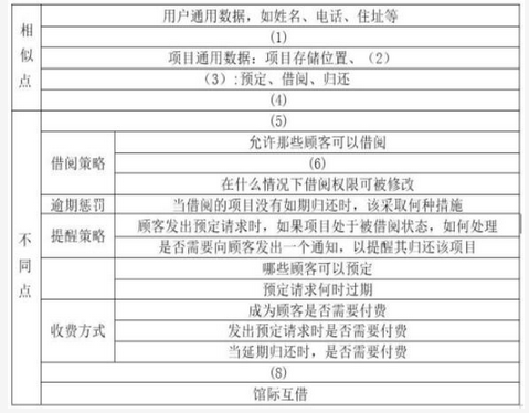 阅读以下关于Web应用系统的叙述,在答题纸上回答问题1至问题3。【说明】某公司因业务需要,拟在短时间内同时完成“小型图书与音像制品借阅系统”和“大学图书馆管理系统”两项基于B/S的Web应用系统研发工作。小型图书与音像制品借阅系统向某所学校的所有学生提供图书与音像制品借阅服务。所有学生无需任何费用即可自动成为会员,每人每次最多可借阅5本图书和3个音像制品。图书需在1个月之内归还,音像制品需在1周之内归还。如未能如期归还,则取消其借阅其他图书和音像制品的权限,但无需罚款。学生可通过网络查询图书和音像制品的状态,但不支持预定。大学图书馆管理系统向某所大学的师生提供图书借阅服务。有多个图书存储地点,即多个分馆。捜索功能应能查询所有的分馆的信息,但所有的分馆都处于同一个校园内,不支持馆际借阅。本科生和研究生一次可借阅16本书,每本书需在1个月内归还。教师一次可借阅任意数量的书,每本书需在2个月内归还,且支持教师预定图书。如预定图书处于被借出状态,系统自动向借阅者发送邮件提醒。借阅期限到达前3天,向借阅者发送邮件提醒。超出借阅期限1周,借阅者需缴纳罚款2元/天。存在过期未还或罚款待缴纳的借阅者无法再借阅其他图书。图书馆仅向教师和研究生提供杂志借阅服务。基于上述需求,该公司召开项目研发讨论会。会议上,李工建议开发借阅系统产品线,基于产品线完成这两个Web应用系统的研发工作。张工同意李工观点,并提出采用MVP(ModelViewPresenter)代替MVC的设计模式研发该产品线。问题内容:【问题1】(6分)软件产品线是提升软件复用的重要手段,请用300字以内的文字分别简要描述什么是软件复用和软件产品线。【问题2】(16分)产品约束是软件产品线核心资产开发的重要输入,请从以下已给出的(a)~(k)各项内容,分别选出产品的相似点和不同点填入表5-1中(1)~(8)处的空白,完成该软件产品线的产品约束分析。(a)项目当前状态;(b)项目操作;(c)预定策略;(d)会员分类;(e)借阅项目数量;(f)项目的类型和属性;(g)检索功能;(h)与支付相关的用户信息;(i)图书编号;(j)教师;(k)学生表5-1产品约束分析