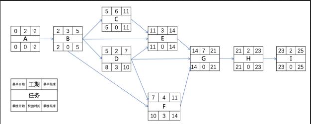 方法②根据PERT,AB与GHI为公共路径,因此确定关键路径只需考察C、D、E、F四个活动即可。不难看出CE=9最长,因此ABCEGHI为最长,是本题的唯一关键路径,总工期为25周。