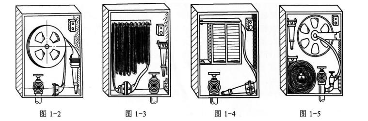 1.分别计算出A住宅建筑的高度和B住宅建筑的层数,并判断它们是否属于高层建筑。2.消火栓箱可以按照安装方式、箱门形式、箱门材料和水带的安装方式等分类。按照水带的安置方式,请写出图1-2、图1-3、图1-4、图1-5的消火栓箱的名称。消防车通道应该设置为什么形状的