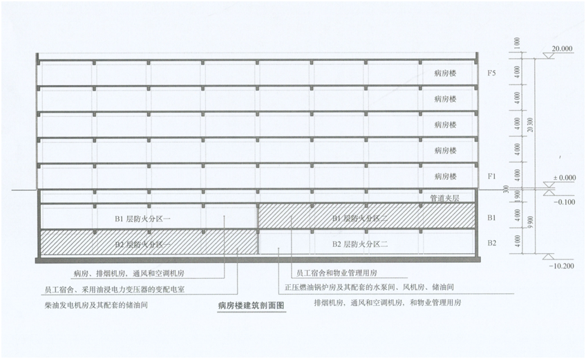 人民防空地下室的耐火等级、特殊场所平面布置和消防设施设置 某医院拟建1栋二级耐火等级的病房楼,该建筑地上5层,地下2层(建筑层数不含管道夹层,地下一、二层战时均为人民防空地下室),每层层高均为4m,建筑高度20.1m(建筑室外设计地面标高一0.1m,建筑首层室内地面标高±0.0m)。该建筑地下每层建筑面积均为1600㎡,地下每层均划分为两个防火分区。该地下室地下二层设有采用油浸电力变压器的变配电室,柴油发电机房及其配套的储油间,正压燃油锅炉房及其配套的水泵间、风机房、储油间,员工宿舍,排烟机房,通风和空调机房,物业管理用房;其中,采用油浸电力变压器的变配电室、柴油发电机房及其配套的储油间,与员工宿舍为1个防火分区;正压燃油锅炉房及其配套的水泵间、风机房、储油间,排烟机房,通风和空调机房,和物业管理用房为1个防火分区。该地下室地下一层设有病房、员工宿舍、排烟机房、通风和空调机房、物业管理用房;其中,病房和排烟机房,通风和空调机房为1个防火分区;员工宿舍和物业管理用房为1个防火分区。 问:1.请指出情景描述中与现行有关国家工程建设消防技术标准不符之处,并说明原因。 2.该人民防空地下室应设置何种消防设施