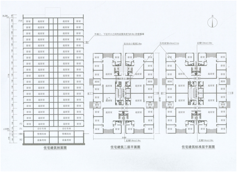 某平屋面塔式住宅建筑,耐火等级一级,地上部分自然层数为19层(一层为室内高度2.2m的自行车库;二层至十九层均为层高3m的住宅楼层,每层均有8个住宅套型且均无天井),地下部分自然层数为2层(地下室的顶板面高出室外设计地面1.5m,地下二层为设备用房层,地下一层为管理用房层,每层层高均为3m且均无外窗井);每层建筑面积均为1200㎡;室外设计地面至其屋面面层的高度为57.7m(建筑室外设计地面标高一1.5m,建筑首层室内地面标高±0.0m)。位于该建筑中心位置的疏散核心筒由一部剪刀楼梯间和两部消防电梯组成;构成剪刀楼梯间的两部防烟楼梯间共用前室,且共用前室与两部消防电梯合用1个前室(合用前室内除前室、楼梯间的门和机械加压送风口外,无其他门窗洞口),合用前室为长方形(长边为6.8m,短边为2.1m),合用前室在首层采用扩大前室并通过1个净宽度为2m的疏散门直通室外(首层的疏散走道及扩大的合用前室内均无可燃物);二层至十九层进入合用前室的安全出口分别位于其南、北两侧,两者分别连通1个长方形疏散走道(长边均为5m,短边均为1rn;两个疏散走道不连通)。该建筑外墙上、下层开口之间均设置高度为0.8m的窗槛墙(均为实体墙),二层至十九层外墙上部分相邻户开口之间的墙体(窗间墙)宽度均为0.8m。该建筑已按现行有关国家工程建设消防技术标准的规定设置了消防设施。