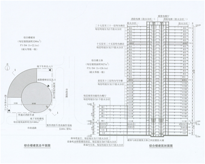 某商务中心区拟建一栋综合楼,该建筑的耐火等级为一级,由高层建筑主体和裙房两部分组成,裙房与高层建筑主体之间设置防火墙。高层建筑主体地上31层,地下4层,建筑高度126.1m(除首层层高为6m外,其他各层层高均为4m;建筑室外设计地面标高一0.1m,建筑首层室内地面标高±0.0m),地上各层每层建筑面积均为5027㎡,地下各层每层建筑面积均为9000㎡,建筑首层底面对地面的正投影为圆形(直径为80m);地下三、四层为普通汽车库,每层均划分为3个防火分区;地下二层为设备机房和管理用房层,划分为6个防火分区;地下一层为商场营业厅,划分为5个防火分区;首层至十三层均为写字楼,每层均划分为2个防火分区;十五层至二十五、二十七层至三十一层均为酒店,每层均划分为2个防火分区;十四层和二十六层均为避难层;地下四层至三十一层每层均设有两部上下直通,且均位于同层不同防火分区内的消防电梯;疏散楼梯在首层均通过东北侧(正东和正北向之间)外墙直通室外。裙房地上5层,建筑高度22.1m,首层底面对地面的正投影为四分之一的圆环形,位于高层建筑主体西北侧(正西和正北向之间),与高层建筑主体四分之一周长的外立面毗连,裙房各层进深均为36m,每层建筑面积均为3280㎡,每层使用功能均为餐厅,每层均划分为1个防火分区。该建筑在其东侧和南侧沿建筑的两个长边设有一条贯通式弧形消防车道;在其东南侧(正东和正南向之间)沿高层建筑主体底边,结合消防车道,连续布置有长度为60m,净宽均为9m的弧形消防车登高操作场地(该场地靠建筑外墙一侧的边缘距离高层建筑主体外墙均为3m)。因该建筑采用弧形屋顶,故未设屋顶直升机停机坪或供直升机救助的设施。该建筑已按现行有关国家工程建设消防技术标准的规定设置了消防设施。
