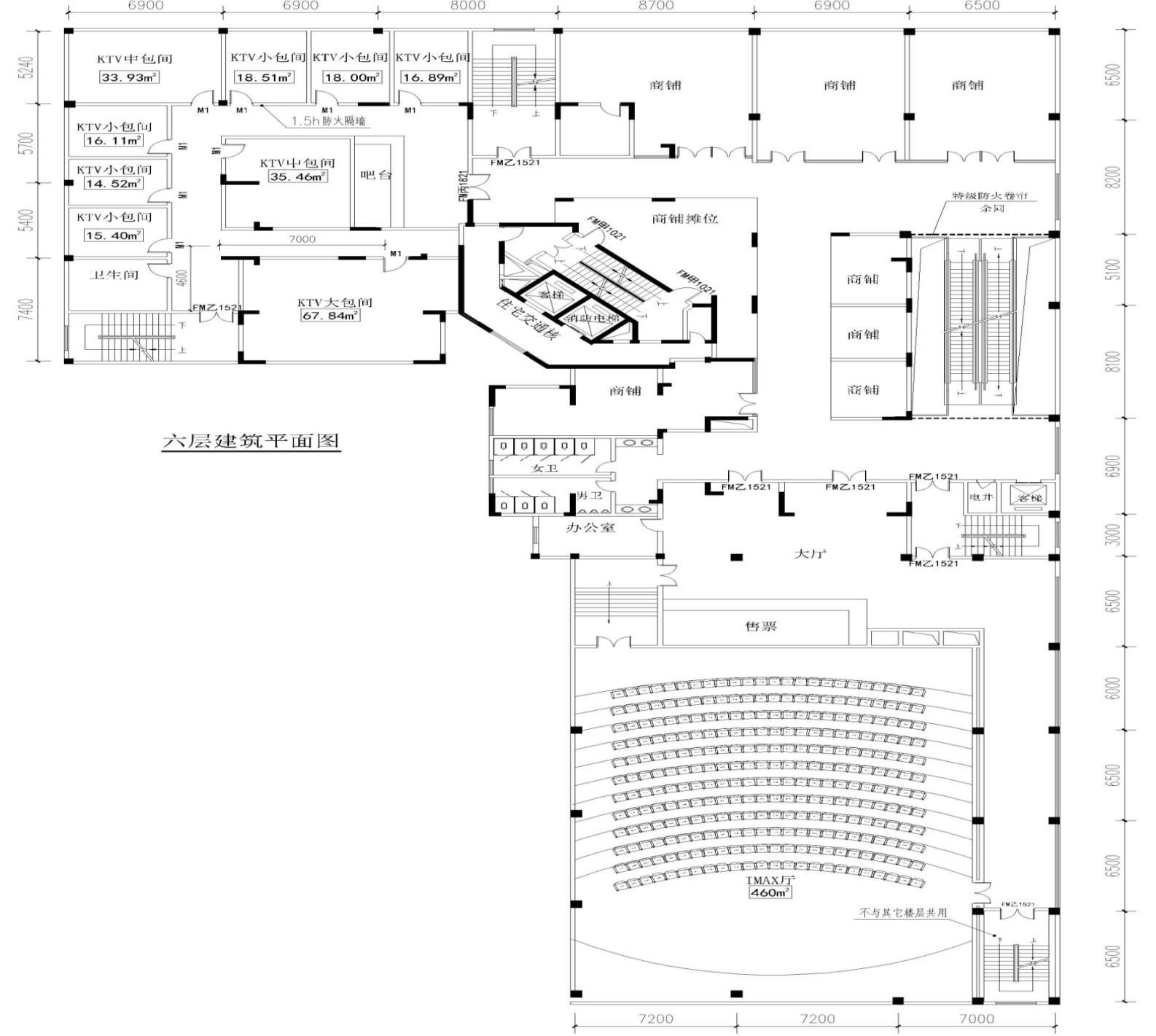 该商场1~4层经营服装、首饰等,5层为儿童娱乐场所,6层为KTV、电影院和商铺,7层为餐饮场所,6层的KTV有大、中、小三种包间,大包间可容纳30人,中包间可容纳15人,小包间可容纳9人。电影院前后排座椅的排距均为0.90m。8层以上功能为住宅建筑,住宅与商场之间采用无门、窗、洞口的防火墙和1.5h的不燃性楼板完全分隔。该建筑按要求设置了消防设施。下图为该建筑6层平面图。