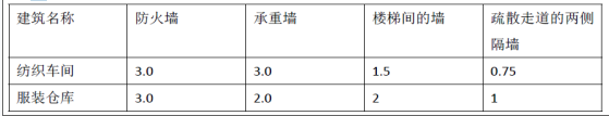 纺织车间南侧为厂区综合办公楼,耐火等级为二级,建筑高度为12m,外墙与纺织车间的距离为10m。纺织车间和服装各主要建筑构件均采用不燃性构件,其耐火极限见下表(单位:h)。