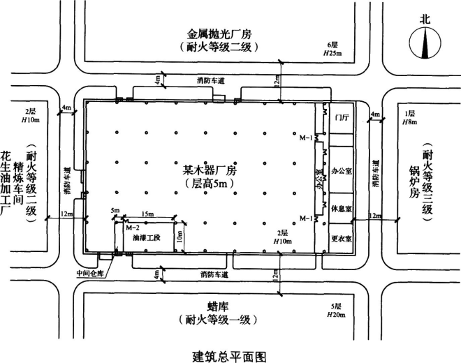 某单层木器厂房为砖木结构,屋顶承重构件为难燃性构件,耐火极限为0.5h。柱子采用不燃性构件,耐火极限为2.50h。木器厂房建筑面积为4500m2,其总平面布局和平面布置如下图所示;木器厂房周边的建筑,面向木器厂房一侧的外墙上均设有门和窗。该木器厂房采用流水线连续生产,工艺不允许设置隔墙。厂房内东侧设有建筑面积500m2的办公区、休息区,采用耐火极限2.50h的防火隔墙与车间分隔,防火隔墙上设有双扇弹簧门;南侧分别设有建筑面积为150m2的油漆工段(采用封闭喷漆工艺)和50m2的中间仓库,中间仓库内储存3昼夜喷漆生产需要量的油漆、稀释剂(甲苯和香蕉水,C=0.11),采用防火墙与其他部位分隔,油漆工段通向车间的防火墙上设有双扇弹簧门。该厂房设置了消防给水及室内消火栓系统、建筑灭火器、排烟设施和应急照明及疏散指示标志。