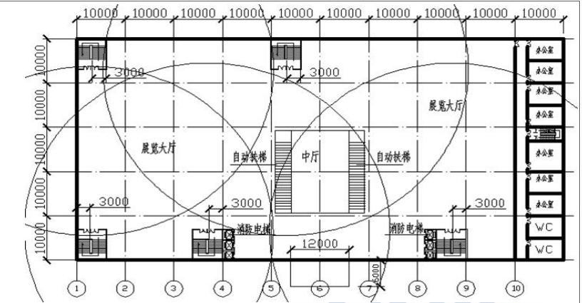 5.至少设 2 个防火分区。该工程已设自喷系统,防火分区面积最大可为 1500×2=3000 ㎡,每层展览大厅平面为 90×50=4500 ㎡,所以每层至少设 2 个防火分区。 防火分区存在问题:没有用防火墙及符合规范要求的防火卷帘划分防火分区。正确做法,在 ⑤轴线处布置防火墙和防火卷帘,左右划分为 2 个防火分区。