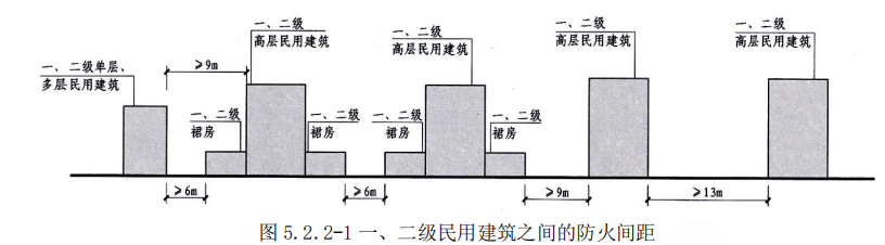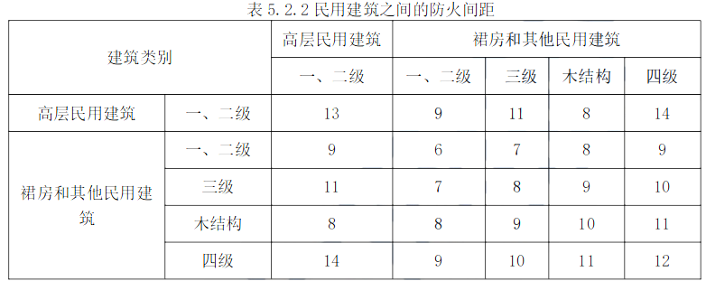 5.2.2 民用建筑之间的防火间距不应小于表 5.2.2 的规定,【如图 5.2.2-1 所示】 与其他建筑的防火间距,除应符合本节规定外,尚应符合本规范其他章的有关规定。