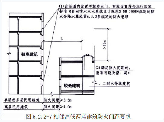 5 相邻两座建筑中较低一座建筑的耐火等级不低于二级且屋顶无天窗,相邻较高一面外墙高出 较低一座建筑的屋面 15m 及以下范围内的开口部位设置甲级防火门、窗,或设置符合现行国家标 准《自动喷水灭火系统设计规范》GB50084 规定的防火分隔水幕或本规范第 6.5.3 条规定的防火卷 帘时,其防火间距不应小于 3.5m;对于高层建筑,不应小于 4m。【如图 5.2.2-7 所示】