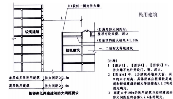 图 5.2.2-6 相邻高低两座建筑防火间距要求
