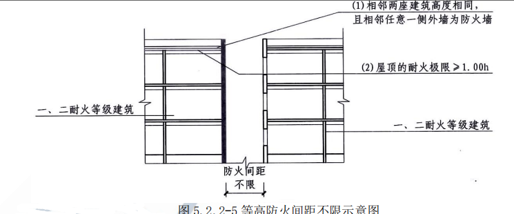 3 相邻两座高度相同的一、二级耐火等级建筑中相邻任一侧外墙为防火墙,屋顶的耐火极限不 低于 1.00h 时,其防火间距不限。【如图 5.2.2-5 所示】