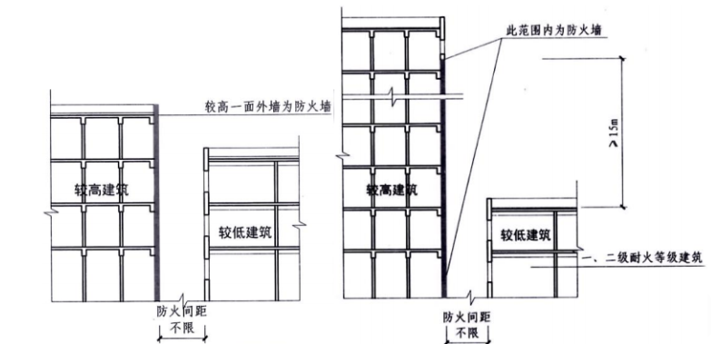 2 两座建筑相邻较高一面外墙为防火墙,【如图 5.2.2-3 所示】 或高出相邻较低一座一、二级耐火等级建筑的屋面 15m 及以下范围内的外墙为防火墙时,其 防火间距不限。【如图 5.2.2-4 所示】