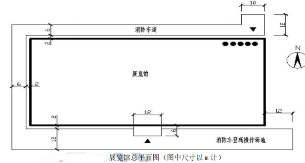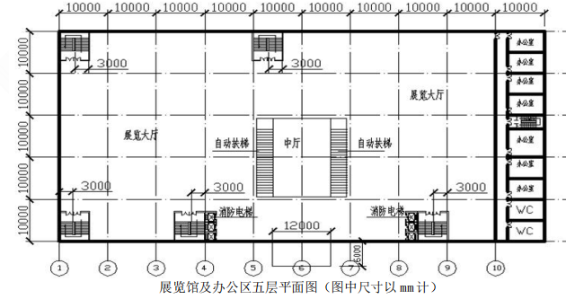 某市拟建一古生物展览馆,每层层高6.0m,室内外高差1.0m,共5层,女儿墙高度1.2m,钢结构。上面是北方向。具体平面布置如图所示,建筑主入口设在南面外墙中间,门厅长12m,宽6m。总平面图如图所示,图中单位以m计。本工程东侧6m处有一个建筑高度为14.5m的耐火等级为二级的上人屋面的办公楼。平面图柱网10m×10m,设有中厅,中厅内设有2座自动扶梯,中厅防火分隔符合规范要求。每部楼梯宽3m。五层平面示意图如图所示(窗户开设符合规范要求,没有示意出来)。