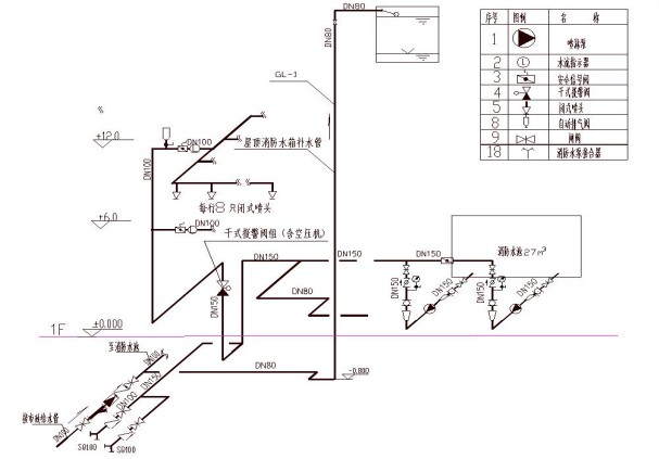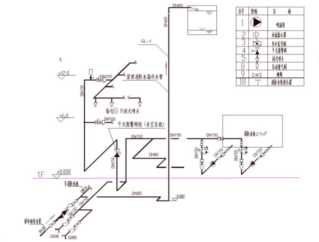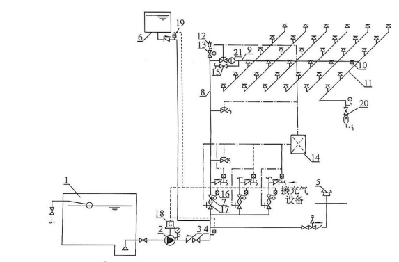 北方某严重危险级Ⅰ级工厂车间,无吊顶及采暖设施。该车间采用全自动无人值守生产线,安装火灾自动报警系统,消火栓系统,及干式自动喷水灭火系统保护;另外设置水幕系统作为防火分隔。车间共2层,每层高6m,每层建筑面积4000㎡。干式自动喷水灭火系统示意图见下图,采用统一规格的闭式玻璃球洒水喷头。