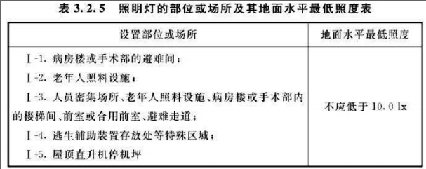 消防应急照明和疏散指示系统技术标准 GB51309-2018 条文: 3.2.5 照明灯应采用多点、均匀布置方式,建、构筑物设置照明灯的部位或场所疏散路径地面 水平最低照度应符合表 3.2.5 的规定。