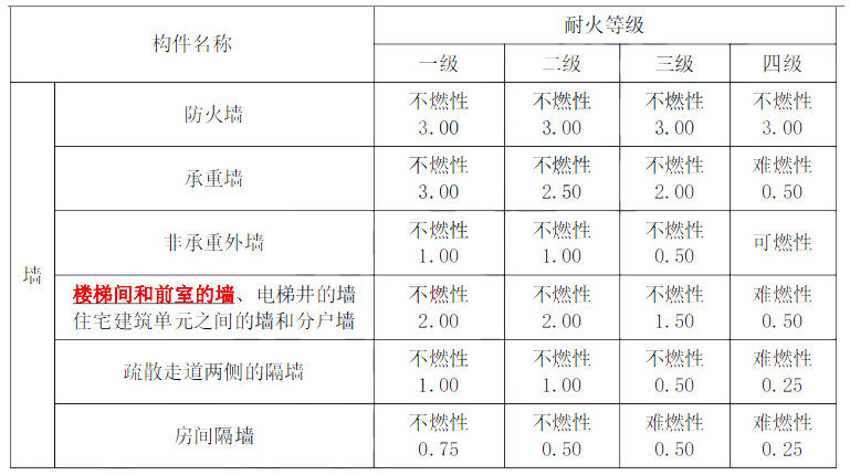 5.1.2 民用建筑的耐火等级可分为一、二、三、四级。除本规范另有规定外,不同耐 火等级建筑相应构件的燃烧性能和耐火极限不应低于表 5.1.2 的规定。(局部表格)