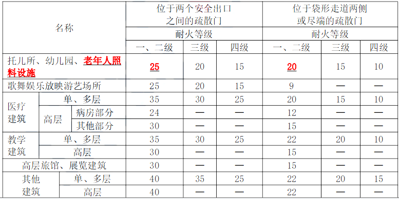 注:1 建筑内开向敞开式外廊的房间疏散门至最近安全出口的直线距离可按本表的规定增加 5m。2 直通疏散走道的房间疏散门至最近敞开楼梯间的直线距离,当房间位于两个楼梯间之间 时,应按本表的规定减少 5m;当房间位于袋形走道两侧或尽端时,应按本表的规定减少 2m。 3 建筑物内全部设置自动喷水灭火系统时,其安全疏散距离可按本表的规定增加 25%。