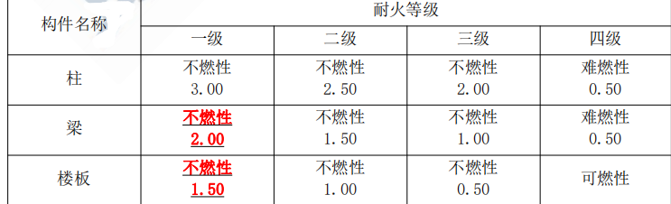表 5.1.2 不同耐火等级建筑相应构件的燃烧性能和耐火等级