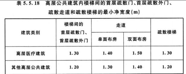 《建筑设计防火规范》GB50016-2014 条文: 5.5.18 除本规范另有规定外,公共建筑内疏散门和安全出口的净宽度不应小于 0.90m,疏散 走道和疏散楼梯的净宽度不应小于 1.10m。 高层公共建筑内楼梯间的首层疏散门、首层疏散外门、疏散走道和疏散楼梯的最小净宽度应 符合表 5.5.18 的规定。