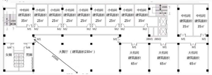 该综合楼三层平面图如图2所示。图中M1、M2为木质隔音门,净宽分别为1.30m和0.90m;M4为普通木门,净宽0.90m;JXM1、JXM2为丙级防火门,门宽0.60m。