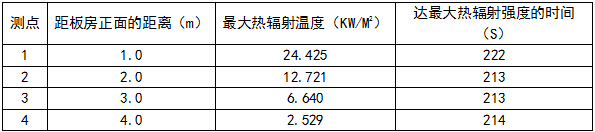 采用燃烧性能为A级,耐火极限≥1h的秸秆纤维板材组装的预测环保型板房,可广泛用于施工工地和灾区过道设置,在静风状态下,对板房进行实体火灾试验,测得距着火板房外墙各测点的最大热辐射如下表所示,据此可判定,该板房安全经济的防火间距是()
