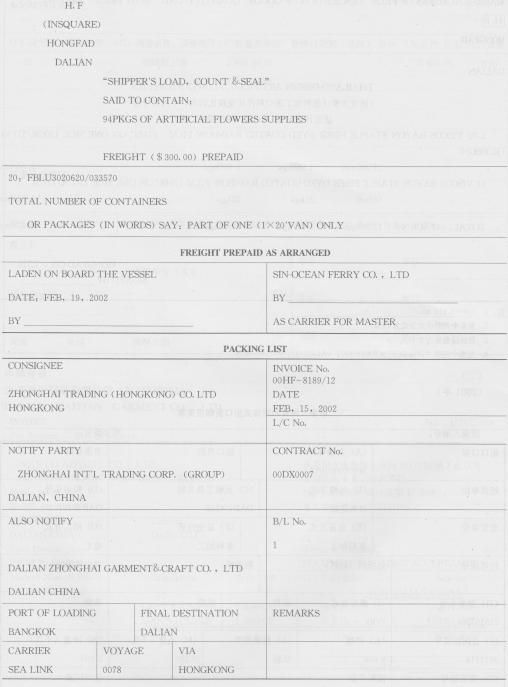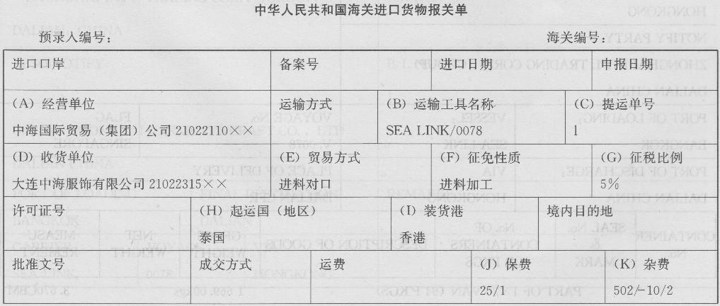 根据图片,查找报关单填制错误,请在此处填写错误代码,例如(GKT)1中海国际贸易(集团)公司(21022110××)委托该集团中海贸易(香港)有限公司进口原缎,交集团下属的中外合资企业大连中海服饰有限公司(21022315××)加工人造花饰品.大连外轮代理公司(21029801××)在船舶到港当日即向海关申报进境,辽宁外运总公司(21029800××)随即持中海国际贸易(集团)公司C09032400322号加工贸易手册向大连海关报关. 1 ()
