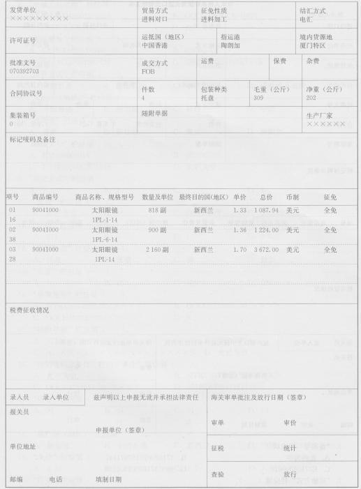 (十二)厦门美视光学工业有限公司于2007年4月出口一批太阳眼镜,货物经香港运至最终目的地后,检验发现部分货物不符合质量要求.经协商,美视光学工业有限公司同意退换该部分货物,由香港原收货方安排退回.(2007年) “备案号”栏应填( ).