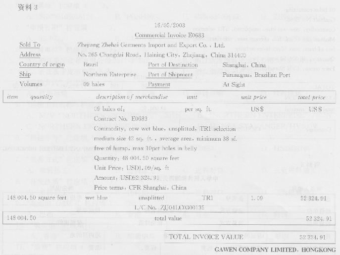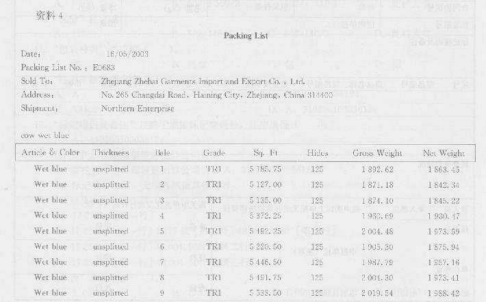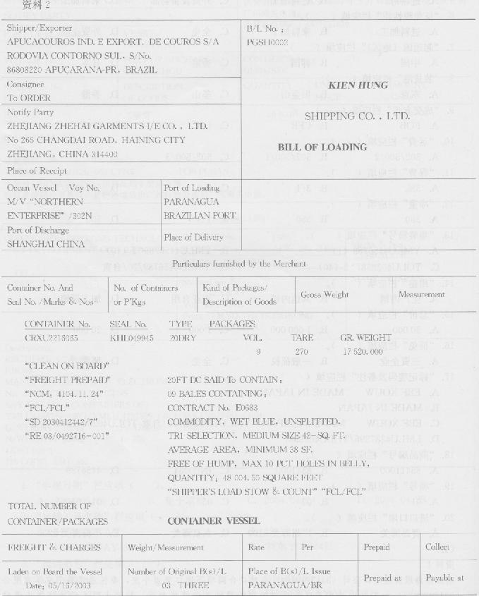 (五)资料l浙江浙海服装进出口公司(3313910194)在对口合同项下进口蓝湿牛皮,委托浙江嘉宁皮革有限公司(3313920237)加工牛皮沙发革.承运船舶在帕腊纳瓜港装货起运,航经大阪,又泊停釜山港转“HANSASTAVANGER”号轮HV300W航次(提单号:HS03D8765)于2003年7月30日抵吴淞口岸申报进境.经营单位委托上海某货运代理公司持C29083100693号手册和310200103036124号入境货物通关单(代码: