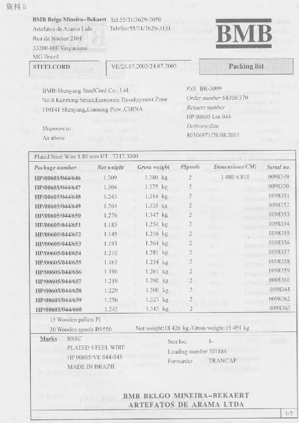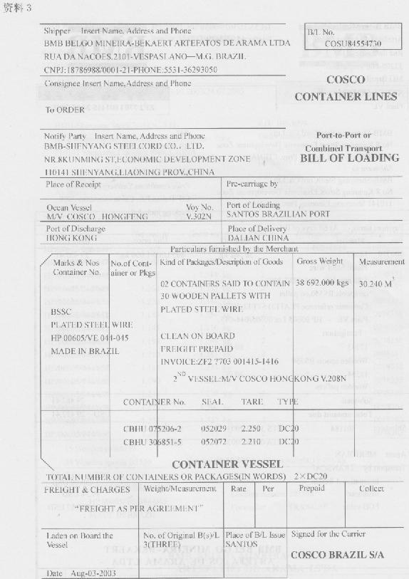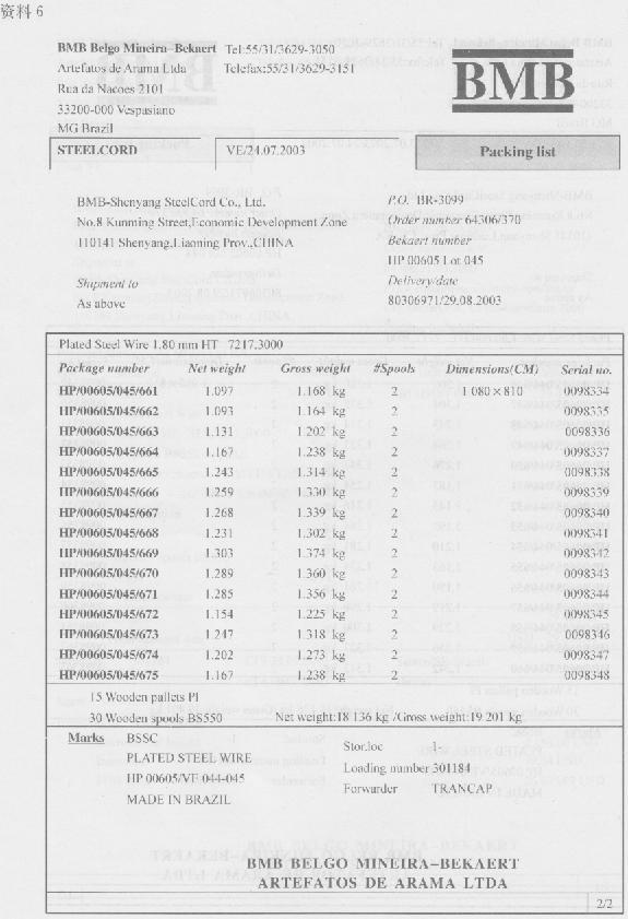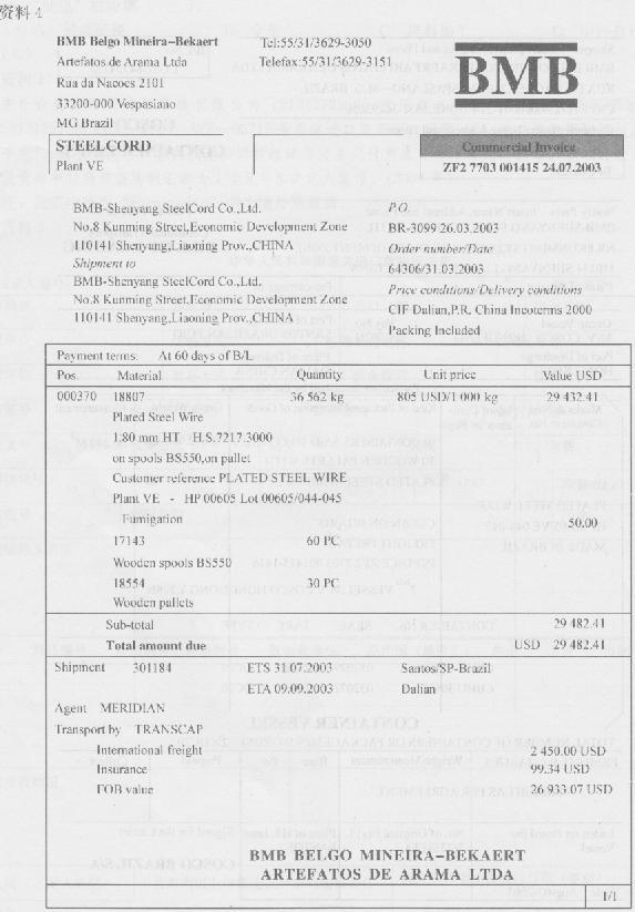 (六)资料1中外合资沈阳贝沈钢帘线有限公司(2101232999)使用自有资金,委托上海新元五矿贸易公司(3105913429)持2100—2003wZ—O0717号自动进口许可证(代码:7)进口镀黄铜钢丝(法定计量单位为千克).货物到港后,报关代理公司报检时为货主代付熏蒸费等410元人民币.舱单件数同装箱单件数.设货物申报当日适用的汇率为1美元=8.2元人民币.(2004年)