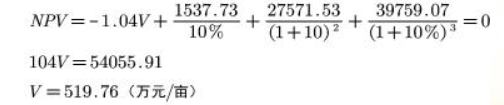 假设土地最高买价为V万元/亩,土地总成本为104V万元