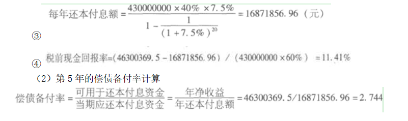 甲公司花4.3亿元购买了一幢写字楼用于出租经营。该公司自有资金投入为购买价格的60%,其余为年利率7.5%、期限20年、按年等额还款的抵押贷款。该写字楼可出租面积为36000m2,前两年的租金均为150元/(m2·月),以后租金每年递增5%。另有地下停车位310个,租金为500元/(个·月)。写字楼与停车位的空置和收租损失为潜在毛租金收入的10%,包括营业税和房产税在内的运营费用为潜在毛租金收入的30%。建筑物采用直线折旧,年折旧额为600万元,土地使用权等无形资产年摊销额为800万元,其他设备的年折旧额为200万元。 请计算该项目第5年的税前现金回报率和偿债备付率。