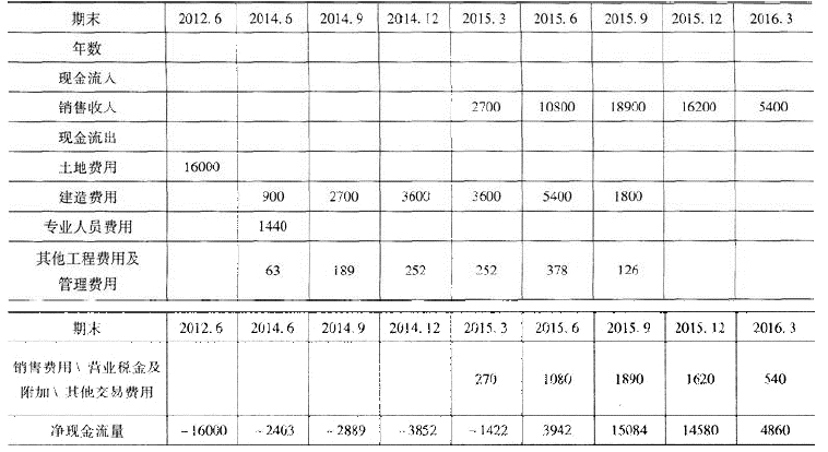 3.5%、5.5%、1%。销售费用、营业税金及附加、其他交易费用发生的进度与销售收入实现进度相同。建造费用和销售收入均发生在季度末(不考虑土地增值税与所得税)。如果以2014年6月末为计算时点,该企业期望的投资收益率为14%,请完成项目投资现金流量表(表2),并计算该项目的财务净现值。(12分)