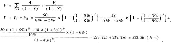 某写字楼的持有期估计为l0年,预测其未来第一年的有效毛收入为50万元,运营费用为18万元,有效毛收入每年增长5%,运营费用每年增长3%;该类房地产的报酬率为8%,持有期结束时的资本化率为10%,转让税费为转售价格的6%。 请计算该写字楼目前的收益价值。