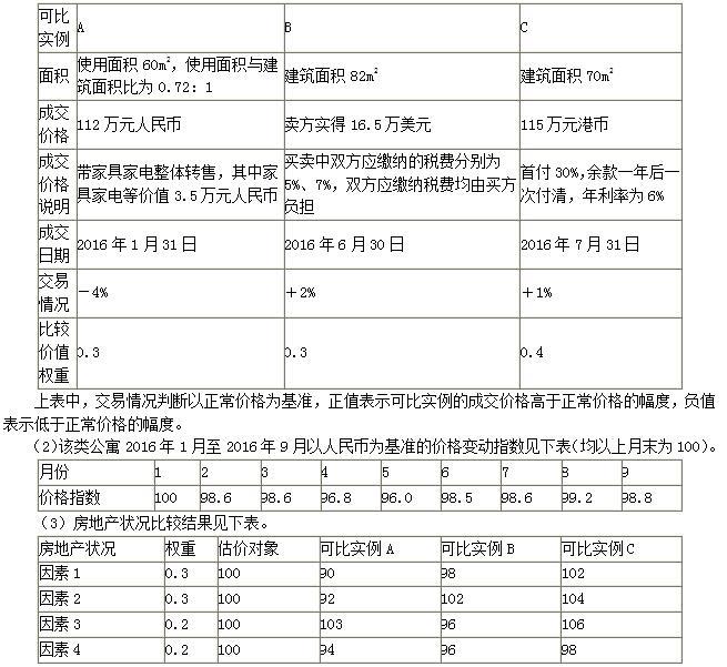 为评估一套建筑面积为75m2的酒店式公寓2016年9月30日的市场价格,选取了三个可比实例,有关资料如下: