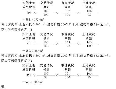 ①采用市场法,利用当地类似土地的出让或转让价格求取土地的重新购置价格。调査选取了A、B、C三个可比实例并进行有关修正、调整如下: